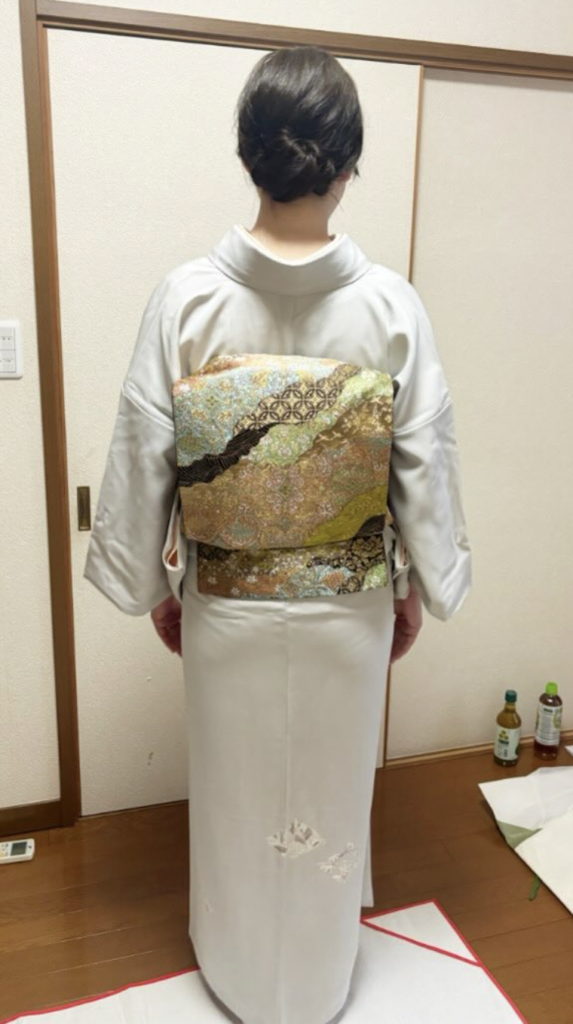 この日お召しになった袋帯は、仕立ててからまだ一度もご使用になられていなかったとのこと。柄行きがとても素敵で、どんなお着物にも合わせやすそうな素敵な帯でしたので、これからさまざまな場面でご活用いただけたら嬉しいです。