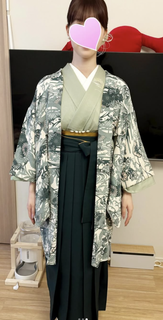 この日は大学の卒業式。雪の影響で開始時間が少し遅れたとのことでしたが、寒さに備えてご準備されていた型染めの羽織がとても素敵で、思わず見惚れてしまうほど好みの一着でした。